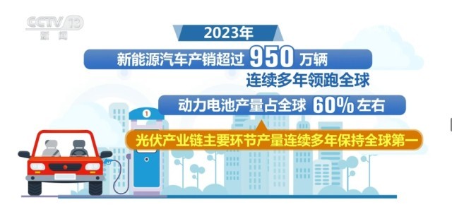 2023年,我國高技術制造業、裝備制造業增加值占規模以上工業增加值比重分別達到15.7%和33.6%。新能源汽車產銷超過950萬輛,連續多年領跑全球,動力電池產量占全球60%左右,光伏產業鏈主要環節產量連續多年保持全球第一。