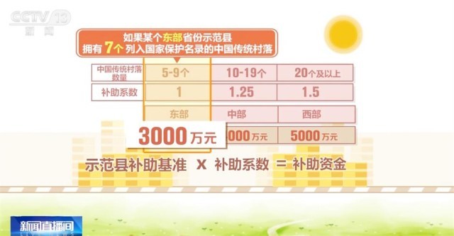 根據規定,中央財政對傳統村落集中連片保護利用示范縣予以定額獎補,其中東、中、西部示范縣補助基準分別為3000萬元、4000萬元、5000萬元。同時,根據示范縣擁有中國傳統村落數量情況賦予相應獎補系數,擁有5—9個、10—19個、20個及以上中國傳統村落的示范縣補助系數分別為1、1.25、1.5。每個示范縣的補助資金為相應的補助基準乘以補助系數。舉個例子,如果某個東部省份示范縣擁有7個列入國家保護名錄的中國傳統村落,中央財政將對這個示范縣進行3000萬元獎補。