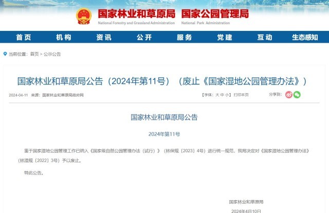 央視網消息:國家林業和草原局發布公告2024年第11號,鑒于國家濕地公園管理工作已納入《國家級自然公園管理辦法(試行)》(林保規〔2023〕4號)進行統一規范,決定對《國家濕地公園管理辦法》(林濕規〔2022〕3號)予以廢止。
