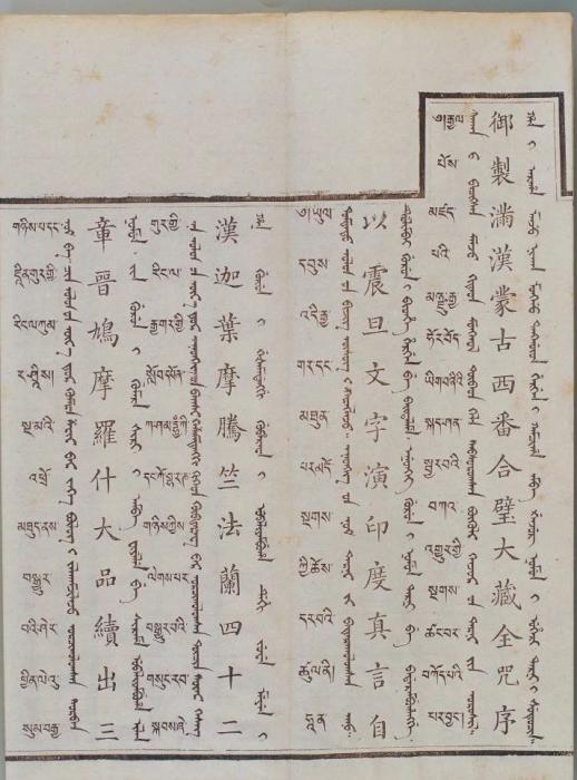 康熙皇帝特別注重刊行蒙古文《甘珠爾》以“利于祭誦”,康熙五十六年(1717年)下令刊刻蒙古文《甘珠爾》。到了乾隆三十二年(1767年),傅恒上書提出,要讓僧人念經念得準,需要標明原音、輔音的韻腳和切音,最好能看著漢字就能念出梵音(“禮今教習僧人持念咒語止,須明曉阿禮嘎禮音韻反切,自能對漢字而得梵音”)。于是,為方便蒙古地區僧人念誦咒語,《御制滿漢西番合璧大藏全咒》添譯了蒙古文。蒙古文《大藏經》是蒙古族歷史文化發展的里程碑,也是蒙古族已知最大部頭的古籍。在譯經過程中,蒙古文字也得到了充分錘煉與發展,提高了交流與表現能力。