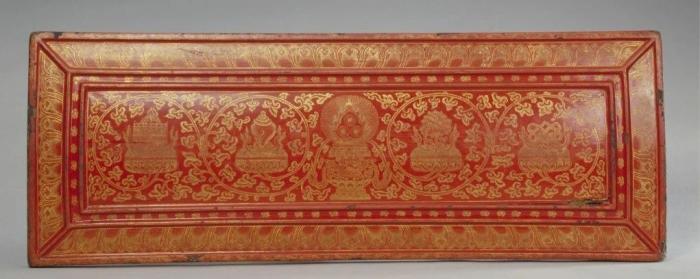 ▲永樂版藏文《大藏經》之紅漆戧金八吉祥紋經文夾板(圖片來源:故宮博物院官網)