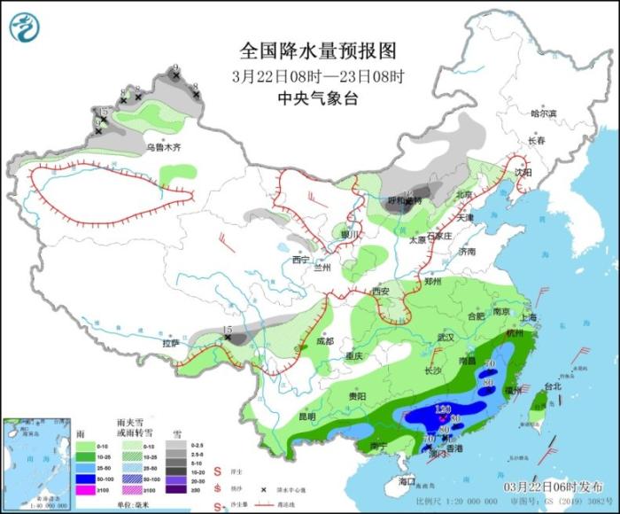 3月22日08時至23日08時,內蒙古中東部、新疆北部、西藏東部、甘肅中部、陜西北部和東南部、山西北部、河北西北部、北京西北部、遼寧西部等地部分地區有小到中雪或雨夾雪,其中,新疆北疆北部和伊犁河谷、西藏東北部、內蒙古中部、山西北部等地部分地區有大到暴雪(10~15毫米)。江南中東部和南部、云南東南部、華南大部、臺灣島等地部分地區有中到大雨,其中,江西南部、福建西部、廣西東北部、廣東中北部及西部沿海等地局部地區有暴雨或大暴雨(100~120毫米)。內蒙古西北部、青海北部、江南南部、華南北部等地部分地區有4~5級風(見圖2)。