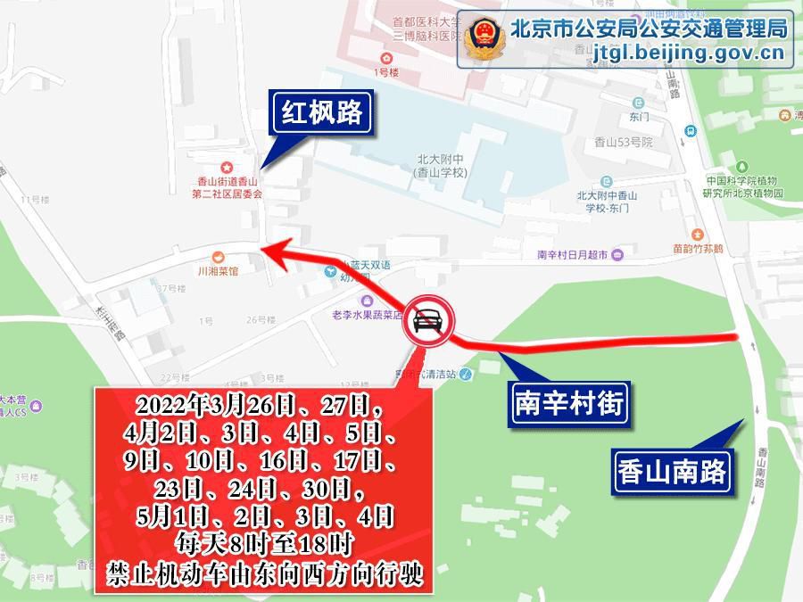特別提示去往香山地區的市民朋友:4月2日、3日、4日、5日、9日、10日、16日、17日、23日、24日,5月1日、2日、3日、4日,每天8時至18時,南辛村街(紅楓路至香山南路段)禁止機動車由東向西方向行駛。