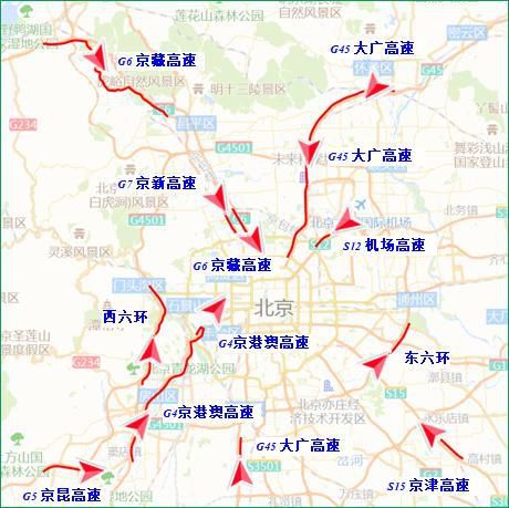 4日、5日12至20時,進京方向的交通壓力將明顯上升,其中京藏高速八達嶺、居庸關、西三旗、北沙灘,京承高速黃港、太陽宮,京港澳高速西道口、琉璃河,京開高速榆垡、玉泉營等路段車流較為集中。