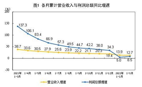 總體來看,一季度減稅降費、助企紓困多措并舉,工業企業利潤保持平穩增長。但也要看到,外部輸入性通脹壓力加大,新冠肺炎疫情多點散發,給工業經濟平穩發展帶來諸多挑戰,企業生產經營困難增多。一季度,規模以上工業企業利潤增速比上年四季度回落3.8個百分點,并且不同行業、不同類型企業間利潤分化明顯;工業企業營業收入增長放緩,工業產銷銜接水平下降,企業庫存高位運行,中小企業成本壓力仍然較大。