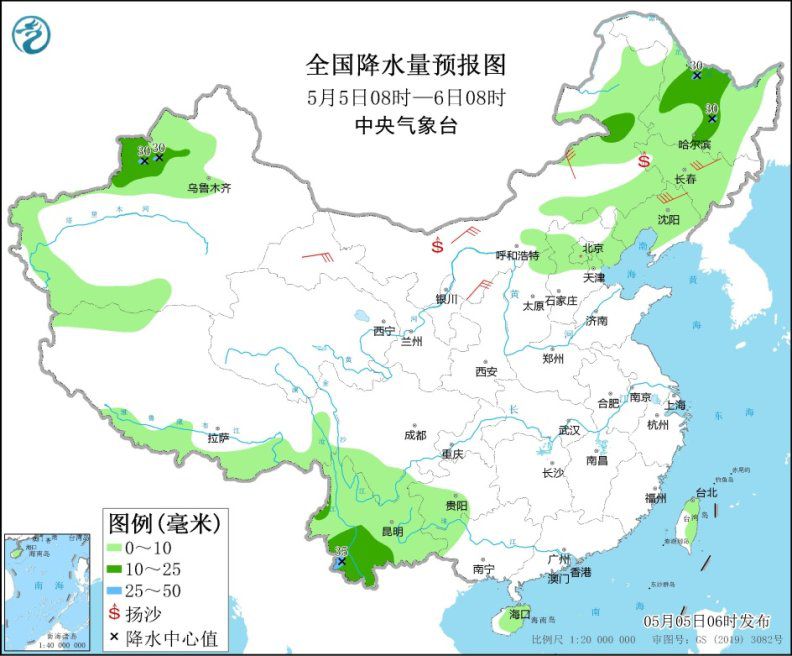 5月5日8時至6日8時,新疆西北部、內蒙古東部、華北中北部、東北地區大部、西南地區南部等地的部分地區有小到中雨,局地有大雨。甘肅河西、內蒙古、東北地區等地有5~7級風,部分地區并伴有浮塵或揚沙天氣。渤海、渤海海峽、黃海北部和中西部海域將有6~7級、陣風8級的偏南風轉東北風。