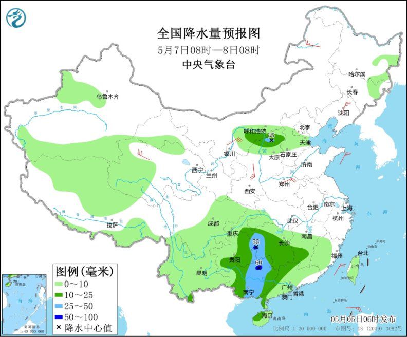 5月7日8時至8日8時,內蒙古河套地區、陜西北部、山西北部、貴州東部和南部、江南西部、華南西部等地的部分地區有中到大雨,其中,湖南西部、廣西北部等地局地有暴雨(50~60毫米)。內蒙古河套地區、東北地區南部、陜西北部等地部分地區有4~6級風。