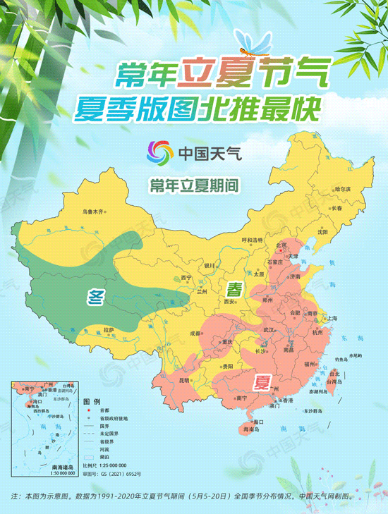 常年立夏節氣期間,全國夏季版圖開始迅速北推,且速度是最快的。夏天的腳步從華南、江南中部等地一路北擴,越過長江、江漢平原等地,最北能抵達華北中部地區,長沙(5月11日)、武漢(5月12日)、鄭州(5月17日)、濟南(5月17日)、石家莊(5月17日)、合肥(5月18日)、天津(5月18日)、南京(5月19日)等城市常年均在立夏節氣期間入夏。