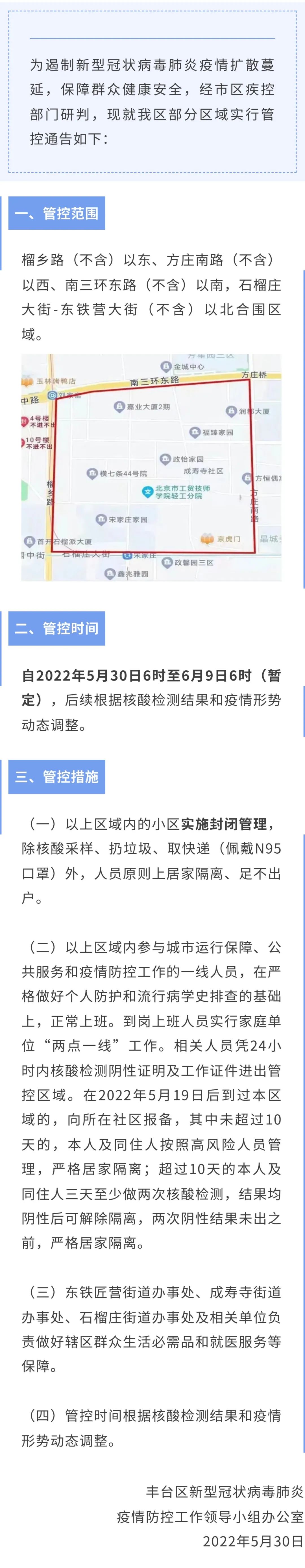 中新網5月30日電 據“北京豐臺”微信公眾號消息,30日,北京市豐臺區新型冠狀病毒肺炎疫情防控工作領導小組辦公室發布關于部分區域管控的通告。管控時間自2022年5月30日至6月9日6時,區域內的小區實施封閉管理,人員原則上居家隔離、足不出戶。