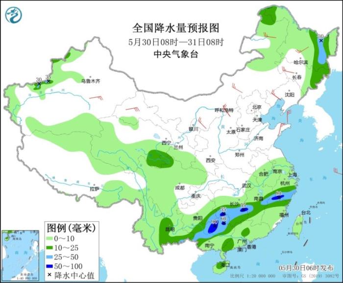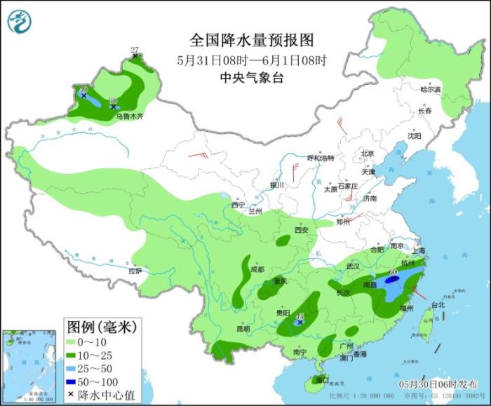 5月30日08時至31日08時,新疆西部、青藏高原北部和東部、內蒙古東北部、黑龍江、吉林東部、江南大部、云南、貴州中南部、華南、蘇皖中南部等地的部分地區有小到中雨,其中,浙江南部、福建北部、江西中部、湖南中南部、廣西北部以及黑龍江東部、新疆南疆西部等地的部分地區有大雨,局地有暴雨(50~90毫米)。內蒙古中東部、東北地區、山西北部、河北北部等地的部分地區有4~6級風。黃海北部和東海北部海域有4~6級、陣風7級的偏西風,東海南部和南海西南部海域有4~6級、陣風7級的西南風。