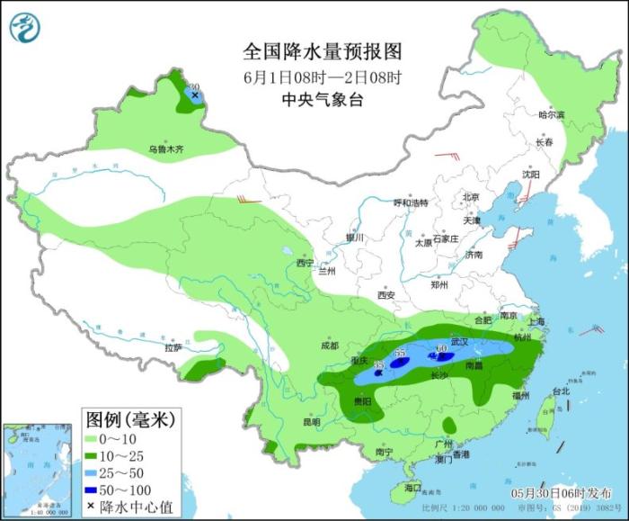 5月31日08時至6月1日08時,新疆沿天山地區和伊犁河谷、湘贛北部、浙江中南部、福建、貴州南部、廣西北部、云南南部、四川盆地東南部等地的部分地區有中到大雨,其中,江西東北部、浙江西部等地局地暴雨(50~60毫米)。內蒙古中西部、甘肅河西、河北南部、河南東部等地的部分地區有4~5級風。黃海中部海域、臺灣以東洋面有5~6級、陣風7級的偏南到西南風,東海南部海域有4~6級、陣風7級的西南風。