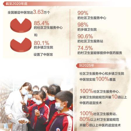 近年來,我國大力推進基層中醫館建設,完善覆蓋基層的中醫藥服務網絡,暢通中醫藥服務基層群眾的“最后一公里”。國家中醫藥管理局公布的數據顯示,截至2020年底,全國基層中醫館達3.63萬個,85.4%的社區衛生服務中心和80.1%的鄉鎮衛生院設置中醫館。基層中醫藥服務可及性進一步提高,99%的社區衛生服務中心、98%的鄉鎮衛生院、90.6%的社區衛生服務站、74.5%的村衛生室能夠提供中醫藥服務。