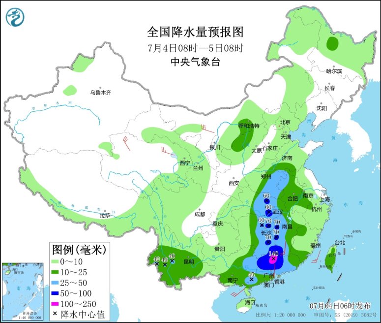 7月4日08時至5日08時,廣東大部、廣西東部、湖南中東部、江西西部和南部、湖北中部、河南東部等地部分地區有大到暴雨,其中,廣東北部等地部分地區有大暴雨(100~140毫米)。內蒙古西部、甘肅西部、青海北部、東北地區南部、江南中部、華南東部等地的部分地區有4~6級風;東海北部海域有6~7級、陣風8級的旋轉風,東海南部海域、臺灣海峽、北部灣、南海北部和中部海域有5~6級、陣風7級的偏南到西南風。
