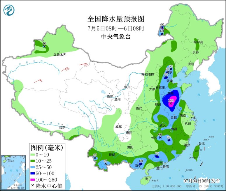 7月5日08時至6日08時,內蒙古中東部、京津冀、黃淮中東部、西南地區南部、江淮大部、江漢東部、江南中東部、華南大部、臺灣島等地的部分地區有中到大雨,其中,山東中南部、河南東部、安徽北部、江蘇北部、京津冀、廣東北部等地的部分地區有暴雨,山東南部、安徽北部、江蘇北部、河南東部等地局地大暴雨(100~180毫米)。新疆北部和東部、內蒙古西部、甘肅西部、東北地區南部、山東半島、江南東部等地的部分地區有4~6級風,其中,新疆東部、浙江東部等地的部分地區風力可達7級以上;東海大部海域、臺灣海峽、北部灣有5~6級、陣風7級的偏南到西南風。