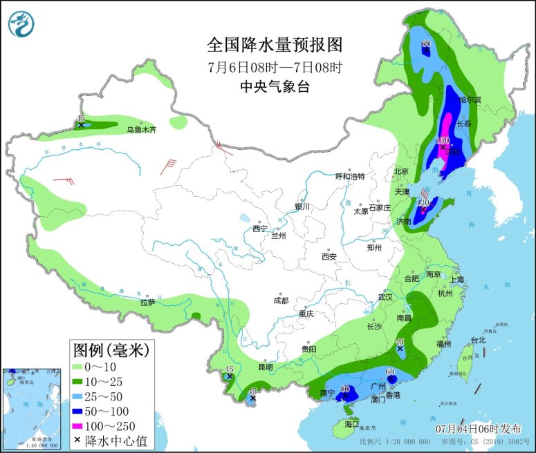 7月6日08時至7日08時,內蒙古東部、黑龍西南部、吉林中西部、遼寧大部、河北東北部、山東、江南東部、華南大部、云南南部等地的部分地區有中到大雨,其中,遼寧大部、吉林西部、黑龍江西南部、山東中北部、廣西東南部、廣東中部和西南部等地的部分地區有暴雨或大暴雨(100~150毫米)。新疆東部和南疆盆地、內蒙古中西部、甘肅西部、東北地區中南部、山東半島、江南東部等地的部分地區有4~6級風,其中,新疆東部、浙江東部等地的部分地區風力可達7級以上;渤海有5~7級、陣風8級的偏北風,渤海海峽、黃海北部海域有6~7級、陣風8級的東南風轉偏南風,黃海中部和南部海域、東海大部海域有5~6級、陣風7級的偏南到西南風。