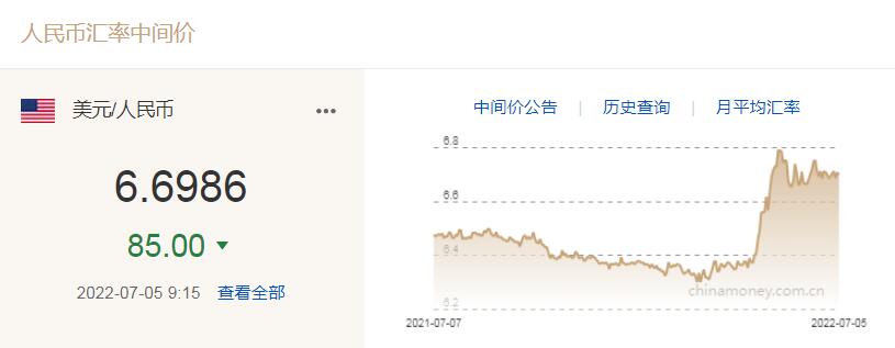 中新網7月5日電 中國人民銀行授權公布,2022年7月5日銀行間外匯市場人民幣匯率中間價為1美元對人民幣6.6986元。這較上一交易日上調85個基點。(中新財經)