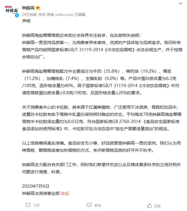 鐘薛高發布聲明:卡拉膠添加量符合國家標準