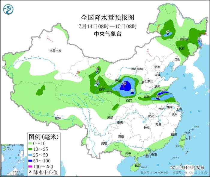 預(yù)計(jì),7月14日08時(shí)至15日08時(shí),西北地區(qū)東部、江蘇北部、安徽北部等地部分地區(qū)有大到暴雨,其中,甘肅東部、陜西北部等地局地有大暴雨(100~120毫米)。上述部分地區(qū)伴有短時(shí)強(qiáng)降水(最大小時(shí)降雨量20~50毫米,局地可超過60毫米),局地有雷暴大風(fēng)等強(qiáng)對(duì)流天氣。中央氣象臺(tái)7月14日06時(shí)發(fā)布暴雨藍(lán)色預(yù)警。