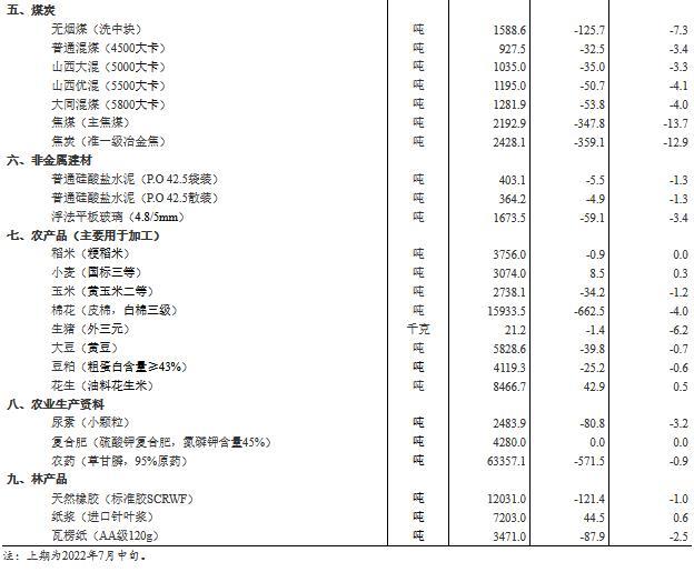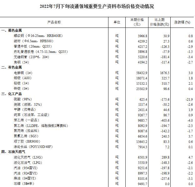 中新網8月4日電 國家統計局4日公布2022年7月下旬流通領域重要生產資料市場價格變動情況,據對全國流通領域9大類50種重要生產資料市場價格的監測顯示,2022年7月下旬與7月中旬相比,15種產品價格上漲,32種下降,3種持平。