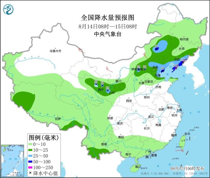8月14日08時至15日08時,內蒙古東部、青海東北部、甘肅南部、寧夏南部、華北中北部、山東北部、遼寧大部、吉林東南部、云南南部等地部分地區有中到大雨,其中,遼寧東部和南部、河北東北部等地部分地區有暴雨,局地大暴雨(100~120毫米)。內蒙古中西部、新疆東部等地部分地區有4~6級風。