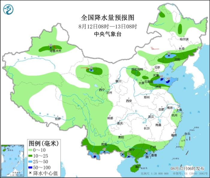8月12日08時至13日08時,內蒙古東南部、吉林東部、遼寧北部、新疆沿天山地區、甘肅河西、陜西北部、河北南部、山東中北部、云南南部、華南南部和海南島等地部分地區有中到大雨,其中,山東北部、云南西南部、廣西南部沿海等地部分地區有暴雨(50~90毫米)。內蒙古中部、甘肅河西等地部分地區有4~6級風。