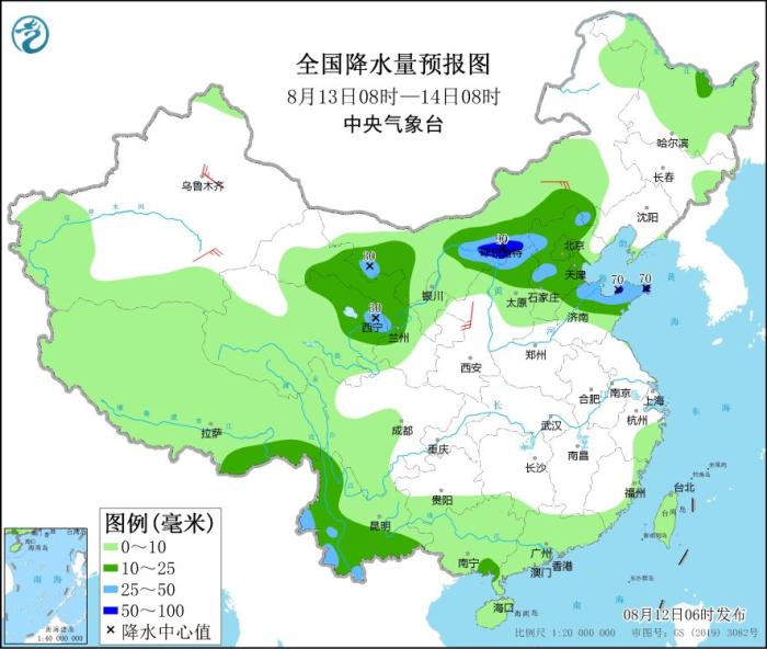 8月13日08時至14日08時,內蒙古中西部、青海東北部、甘肅中部、華北中北部、山東中北部、云南南部等地部分地區有中到大雨,其中,內蒙古中部、山東半島北部等地部分地區有暴雨(50~90毫米)。內蒙古中部、新疆沿天山地區和南疆盆地等地部分地區有4~6級風。