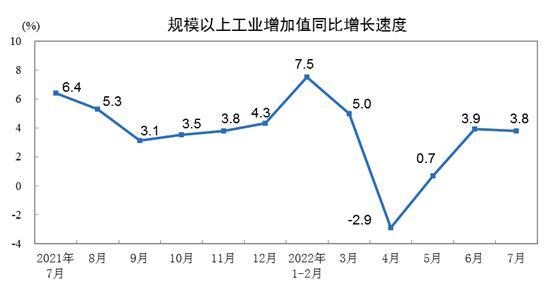 國家統計局:7月份規模以上工業增加值增長3.8%