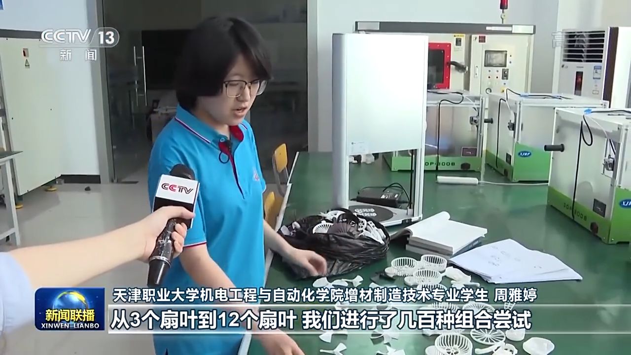 天津職業(yè)大學(xué)機(jī)電工程與自動(dòng)化學(xué)院增材制造技術(shù)專業(yè)學(xué)生 周雅婷:這些都是我們通過(guò)3D打印打印出來(lái)的,從3個(gè)扇葉到12個(gè)扇葉,我們進(jìn)行了幾百種組合嘗試。如果差0.1毫米的話,可能會(huì)導(dǎo)致風(fēng)扇卡住。