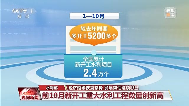 水利部今天發布數據顯示:1—10月,全國累計新開工水利項目2.4萬個,較去年同期多開工5200多個,其中新開工重大水利工程45項,創歷史新高。