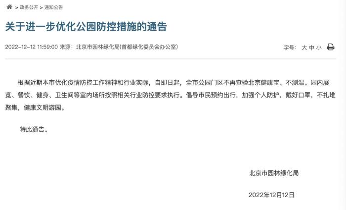 12月12日,北京市園林綠化局發布關于進一步優化公園防控措施的通告。