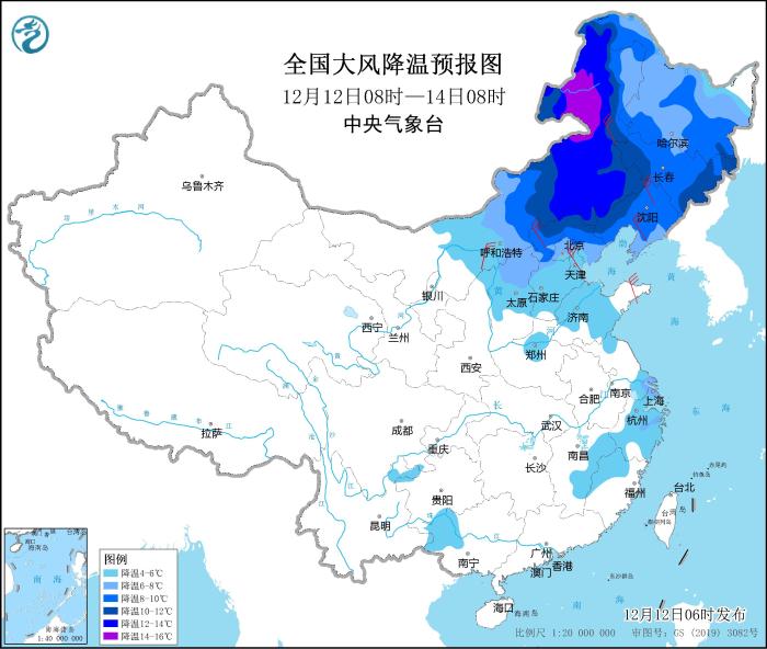 其中,12月12日08時(shí)至14日08時(shí),內(nèi)蒙古中東部、東北地區(qū)大部、華北中北部、山東中部、河南北部、江南中東部等地氣溫將下降4~8℃,其中,內(nèi)蒙古東部、河北北部、遼寧西部、吉林西部等地部分地區(qū)降溫幅度可達(dá)10℃以上;上述部分地區(qū)并有4~6級偏北風(fēng),陣風(fēng)7~8級。中央氣象臺(tái)12月12日06時(shí)繼續(xù)發(fā)布大風(fēng)降溫預(yù)報(bào)。