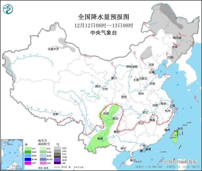 12月12日08時(shí)至13日08時(shí),新疆阿勒泰和南疆盆地西部山區(qū)、內(nèi)蒙古中部和東北部、黑龍江、吉林中東部、遼寧東部等地的部分地區(qū)有小到中雪或雨夾雪。四川東部、云南東部和南部、臺(tái)灣島等地的部分地區(qū)有小雨,局地中雨。華北大部、東北地區(qū)大部、河南東部、山東半島等地的部分地區(qū)有4~6級風(fēng),其中,內(nèi)蒙古中西部等地部分地區(qū)有6~7級風(fēng)(見圖3)。