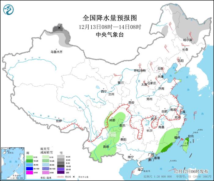 圖3 全國降水量預(yù)報(bào)圖(12月12日08時(shí)-13日08時(shí))