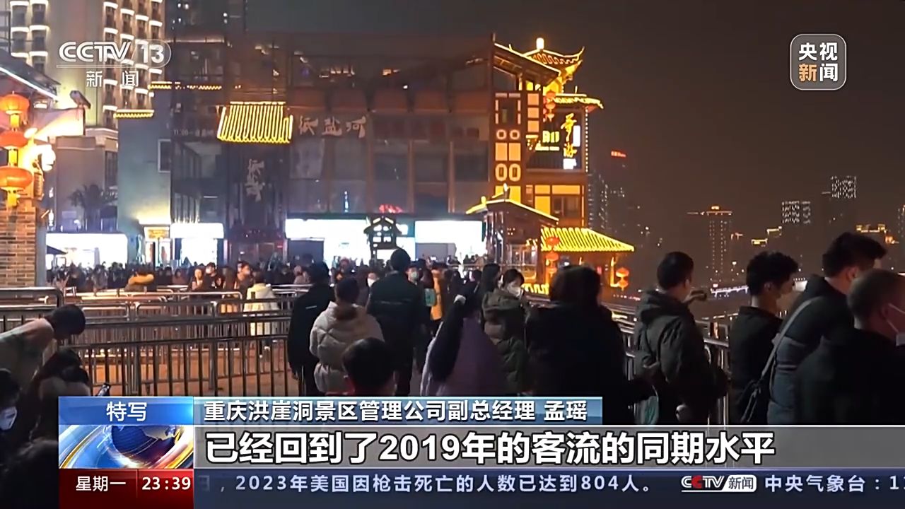 重慶洪崖洞景區管理公司副總經理 孟瑤:本來按照我們的預估,可能會在今年的二到三月份,游客量會有一個明顯的回升。元旦的第一天和第二天,我們的客流分別已經達到了6.4萬和6.2萬,已經回到了2019年的客流的同期水平,甚至已經超過了17%。