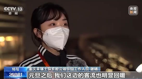 重慶來福士探索艙云端樂園工作人員謝婧:元旦之后,我們這邊的客流也明顯回暖,同比疫情之前客流明顯回暖到7成左右。