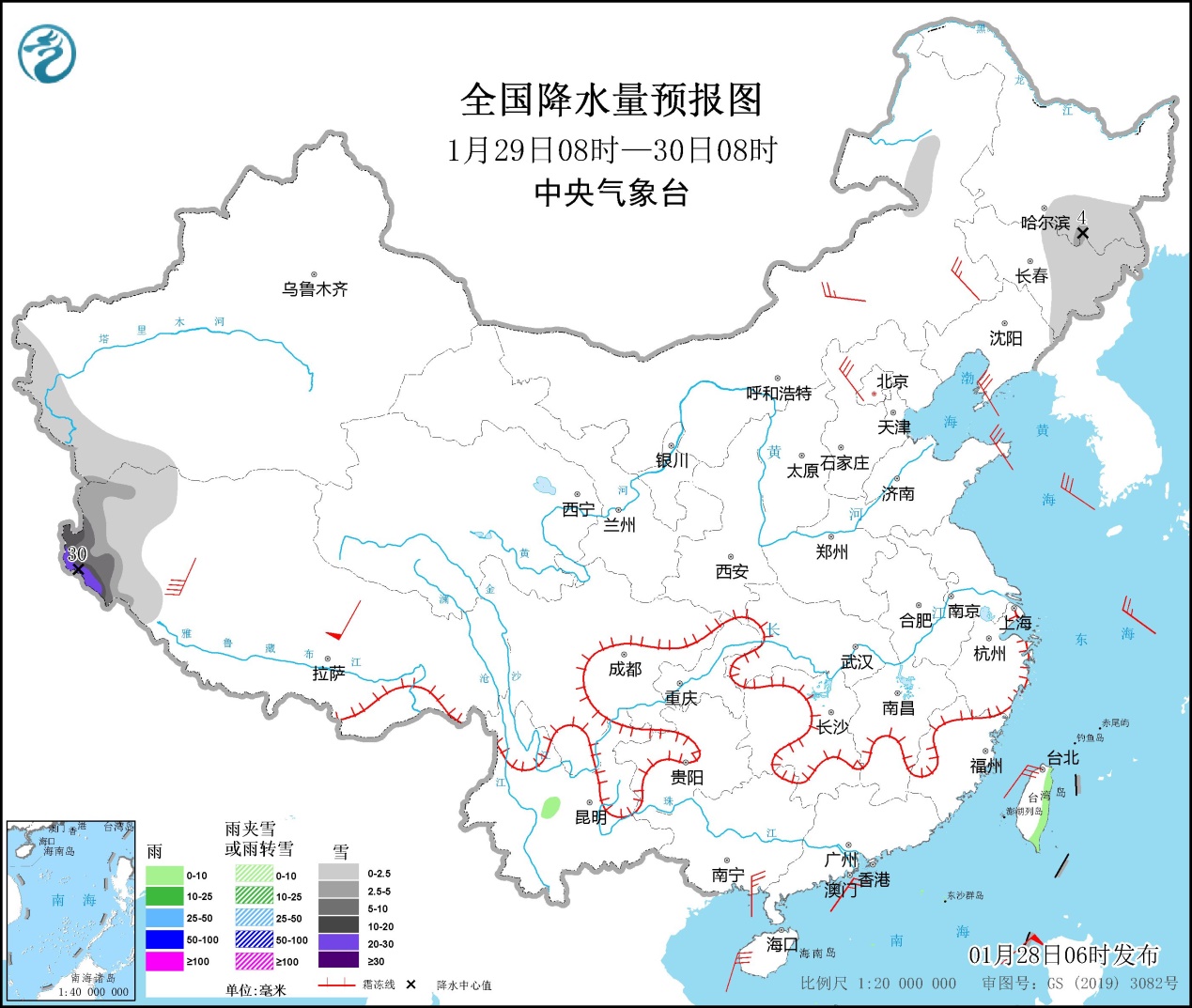 1月28日08時至29日08時,新疆西南部山區(qū)、內(nèi)蒙古東北部、黑龍江南部、吉林北部和東部、云南西北部、西藏東部等地的部分地區(qū)有小雪或雨夾雪,其中新疆西南部山區(qū)局地中雪或大雪(5~8毫米);西藏東南部、云南中部、臺灣島東部等地的部分地區(qū)有小雨。內(nèi)蒙古大部、華北北部、黑龍江東部、遼寧、山東半島、浙江、廣西東南部等地的部分地區(qū)有4~6級風(fēng),西藏中西部的部分地區(qū)風(fēng)力可達(dá)7級以上(見圖1)。渤海、渤海海峽、黃海大部海域、東海大部海域、臺灣海峽、南海大部海域、北部灣有6~8級、陣風(fēng)8~10級的大風(fēng),其中臺灣海峽、南海中東部和西南部的部分海域風(fēng)力可達(dá)9級、陣風(fēng)10~11級。