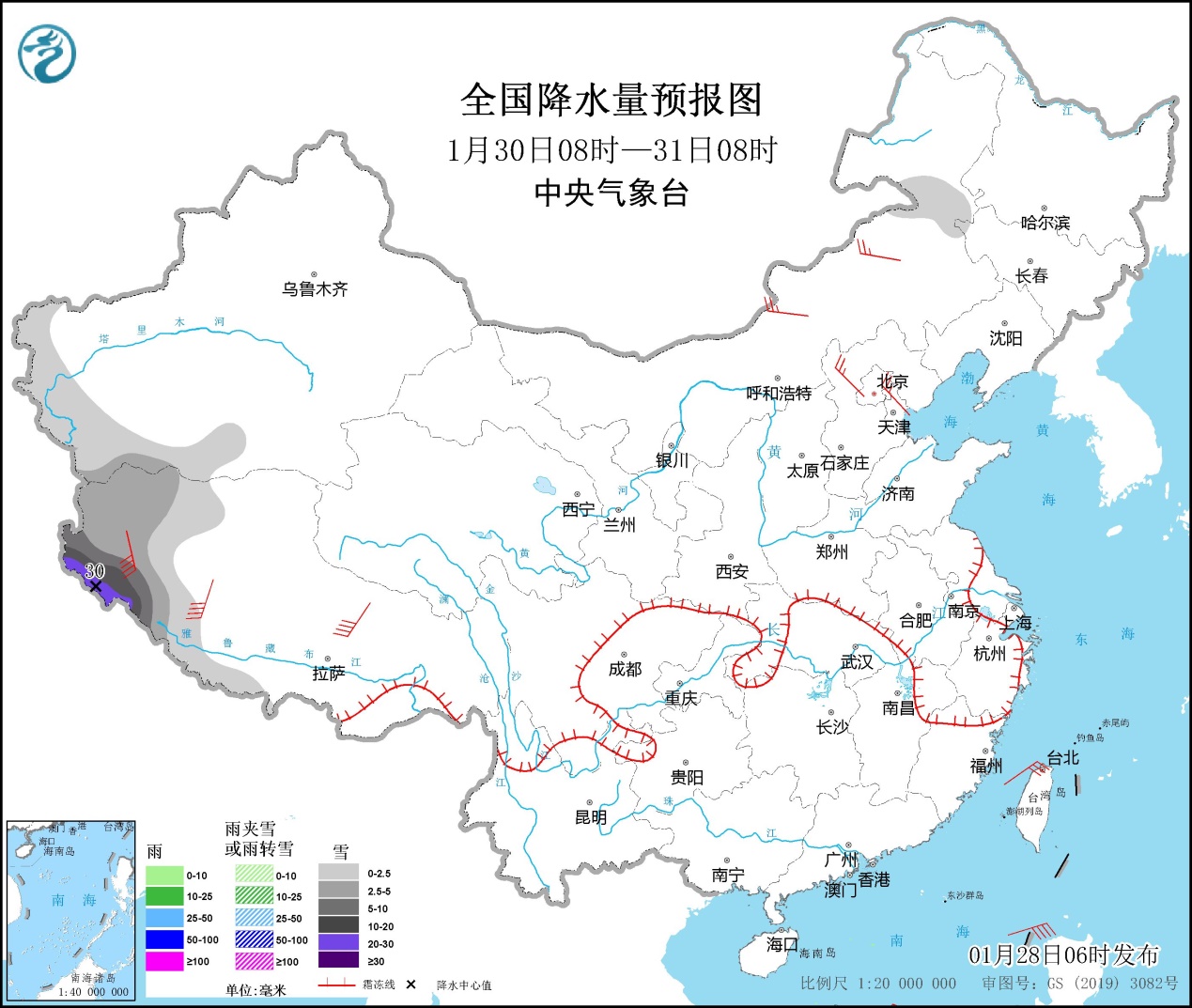 全國降水量預(yù)報圖(1月30日08時-31日08時)。圖片來源:中央氣象臺網(wǎng)站