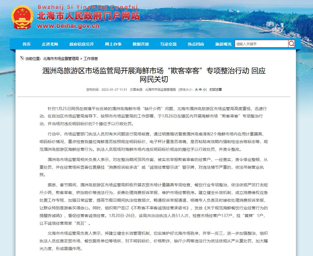 中新網1月28日電 據北海市市場監督管理局網站27日消息,針對1月25日網民在微博平臺反映的潿洲島海鮮市場“缺斤少兩”問題,北海市潿洲島旅游區市場監管局高度重視,迅速行動,在自治區市場監管局指導下,按照市市場監管局的工作部署,于1月26日在轄區內開展海鮮市場“欺客宰客”專項整治行動,并當場對違反明碼標價的7個攤位予以行政處罰。