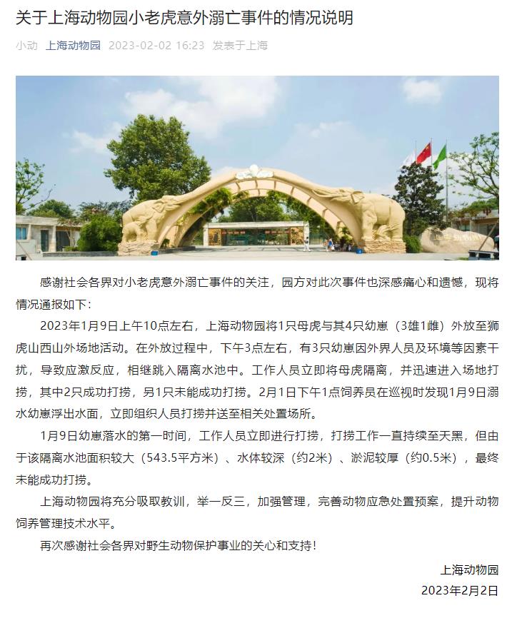 中新網(wǎng)2月2日電 據(jù)“上海動物園”微信公眾號消息,上海動物園2日發(fā)布關(guān)于上海動物園小老虎意外溺亡事件的情況說明,2023年1月9日上午10點(diǎn)左右,上海動物園將1只母虎與其4只幼崽(3雄1雌)外放至獅虎山西山外場地活動。在外放過程中,下午3點(diǎn)左右,有3只幼崽因外界人員及環(huán)境等因素干擾,導(dǎo)致應(yīng)激反應(yīng),相繼跳入隔離水池中。工作人員立即將母虎隔離,并迅速進(jìn)入場地打撈,其中2只成功打撈,另1只未能成功打撈。2月1日下午1點(diǎn)飼養(yǎng)員在巡視時發(fā)現(xiàn)1月9日溺水幼崽浮出水面,立即組織人員打撈并送至相關(guān)處置場所。