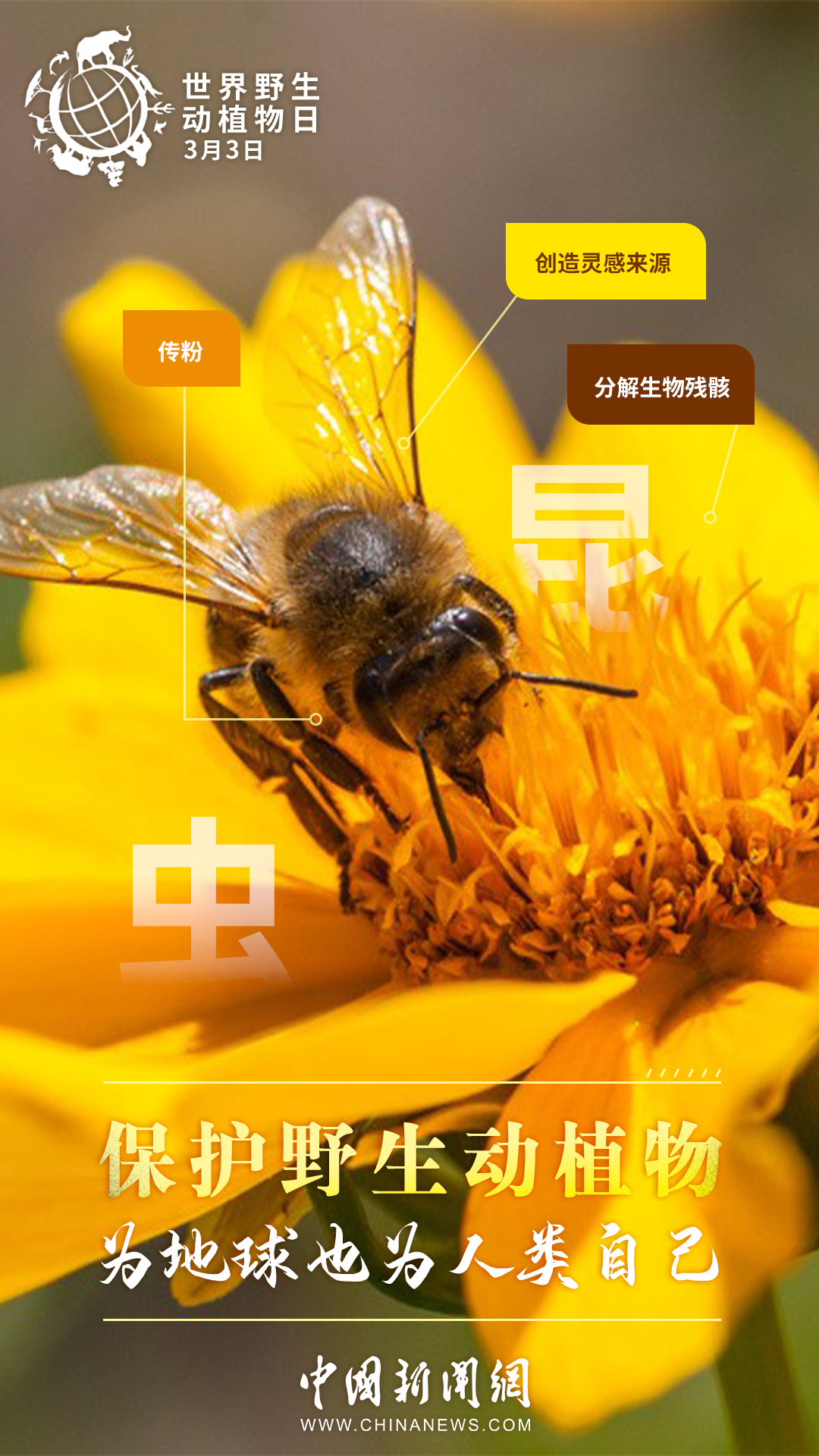 世界約80%的農作物都依賴蜜蜂等蟲媒傳粉,一座鯨的尸體可以供養一套以分解者為主的循環系統長達百年……其實,大自然里的每種生物都有它存在的價值。今天是第十個“世界野生動植物日”,戳圖了解它們的作用,一起來保護野生動植物。