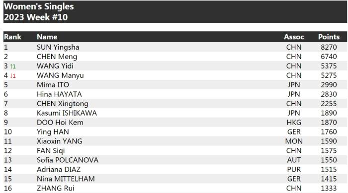 女單方面,孫穎莎以8270分領先,穩居第一,陳夢6740分位居第二,王藝迪5375分位列第三,王曼昱排名第四。日本選手伊藤美誠以2990分排在第五位。