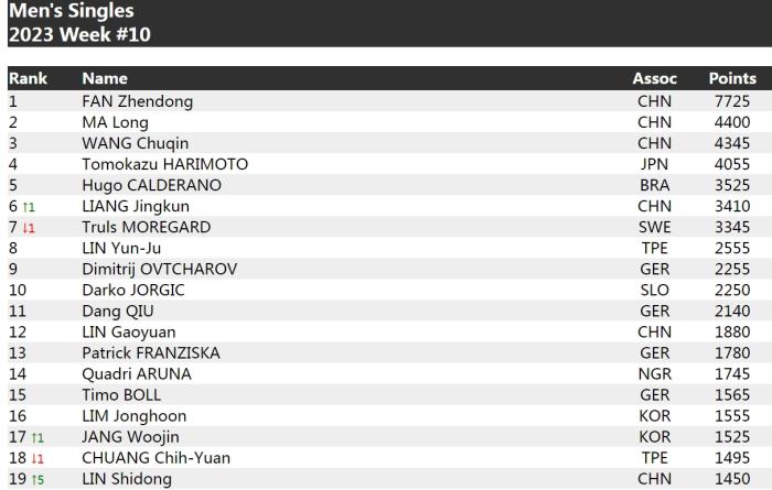 男單方面,樊振東繼續保持優勢,以7725分排名第一,馬龍以4400分位列第二,王楚欽以4345分排名第三,梁靖崑3410分排名第六,較第9周排名上升一位。