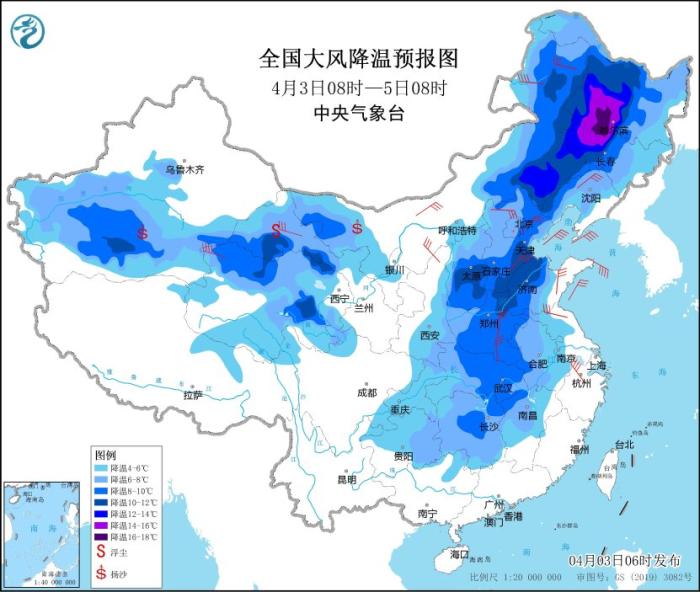 受較強冷空氣影響,4月3日08時至5日08時,新疆南疆盆地、西北地區中部、內蒙古西部和東北部、華北、東北地區、黃淮、江漢、江淮中西部、江南中西部等地氣溫將下降4~8℃,其中,內蒙東北部、東北地區西部、華北南部等地局地降溫幅度可達10℃以上;上述部分地區并有5~6級偏北風,陣風7~9級。新疆南部和東部、內蒙古西部、甘肅西部等地有沙塵天氣(見圖1)。3日夜間,渤海、黃海西南部海域、東海西北部海域、長江口附近海域將有8級、陣風9級的大風,其中渤海灣將有9級、陣風10級的大風。中央氣象臺4月3日06時繼續發布大風降溫預報和海上大風黃色預警。