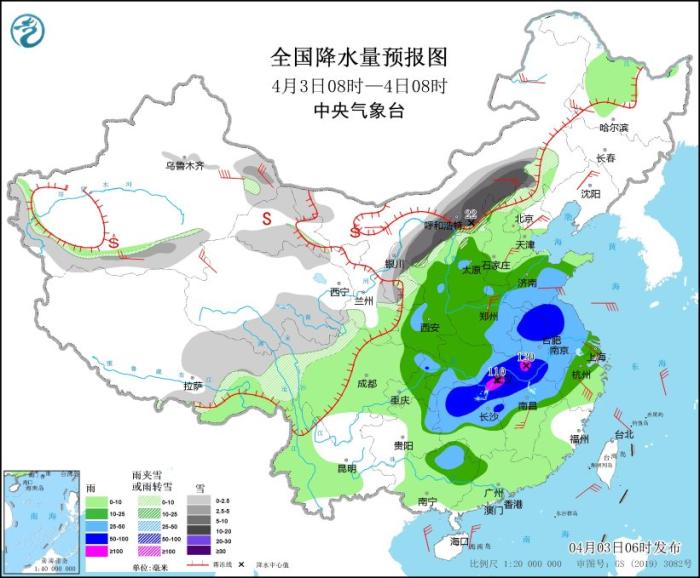 4月3日至4日,我國中東部地區有一次大范圍降水天氣過程,西北地區東部、西南地區東部、黃淮、江淮、江漢、江南、華南等地有中到大雨,部分地區有暴雨,局地有大暴雨;甘肅東部、寧夏、內蒙古中東部等地有中到大雪或雨夾雪,內蒙古中部等地局地暴雪或大暴雪。其中,4月3日08時至4日08時,湖北東部和南部、湖南北部、江西北部、安徽、河南東部、山東南部、江蘇及陜西中部、山西中部、重慶北部、廣西東北部等地有大到暴雨,其中,安徽西南部、湖北東部、湖南北部等地部分地區有大暴雨(100~130毫米)。上述部分地區伴有短時強降水(最大小時降雨量20~50毫米,局地可超過60毫米),局地有雷暴大風、冰雹等強對流天氣。內蒙古中部的部分地區有大到暴雪,局地大暴雪(見圖2)。中央氣象臺4月3日06時繼續發布暴雨藍色預警和強對流天氣藍色預警。