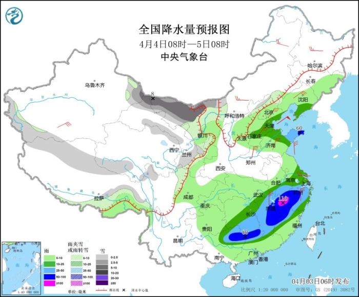 4月4日08時至5日08時,內蒙古西部、新疆南疆盆地和東部、西藏北部和東部、西北地區中東部、川西高原北部等地部分地區有小雪或雨夾雪,其中,內蒙古西北部、新疆東部等地部分地區有中到大雪(5~8毫米)。遼東半島、華北東部、山東半島、江南大部、華南北部等地部分地區有中到大雨,其中,山東東部、安徽南部、湖南南部、江西中東部、浙江西部、福建西北部、廣西東北部、廣東西北部等地部分地區有暴雨或大暴雨(100~110毫米)。內蒙古中東部、東北地區、新疆南疆盆地、華北、江淮東部、江南東部等地部分地區有4~6級風(見圖4)。渤海、渤海海峽將有7~9級、陣風10級的偏北風,黃海中部和南部將有7~8級、陣風9級的東南風,東海北部將有7~8級、陣風9級的東南風轉6~7級、陣風8級的偏南風。