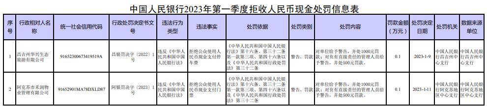 2023年第一季度,人民銀行依法對昌吉州華興生態旅游有限公司、阿克蘇市禾潤物業管理有限公司等2家拒收人民幣現金的單位及相關責任人作出經濟處罰。