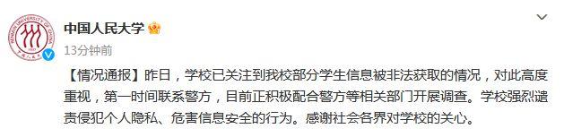 中新網7月2日電 據中國人民大學官方微博消息,昨日,學校已關注到該校部分學生信息被非法獲取的情況,對此高度重視,第一時間聯系警方,目前正積極配合警方等相關部門開展調查。學校強烈譴責侵犯個人隱私、危害信息安全的行為。感謝社會各界對學校的關心。