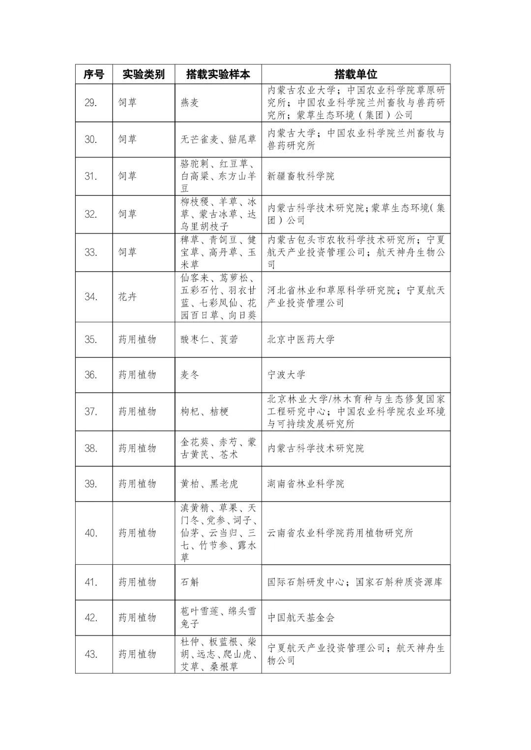 載人航天工程立項實施以來,始終注重提升工程綜合效益,致力服務國家經濟社會發展。在工程歷次飛行任務中,均安排了航天育種搭載實驗項目。從神舟十六號載人飛船開始,中國載人航天工程辦公室向社會公開征集航天育種搭載實驗項目,于3月23日在工程官網發布《關于征集神舟系列載人飛船航天育種實驗項目的機會公告》,同時在工程官網開辟“航天育種搭載實驗”管理平臺,接受搭載需求單位申報實驗項目。辦公室組織專家對申報項目進行評審,遴選出53個單位的136種份航天育種實驗材料實施搭載。包括農作物47份(糧食作物種子12份、經濟作物種子28份、耐鹽堿植物7份);林草、花卉和藥用植物76份(林木17份、飼草21份、花卉7份、藥用植物31份);微生物和其它13種(農業微生物菌種2種、工業微生物菌種3種、食用菌3種、藻類和苔蘚5種)(清單附后)。
