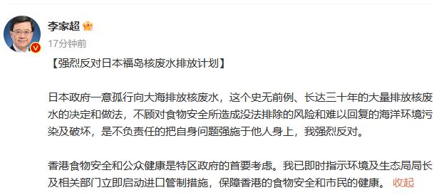 李家超:強烈反對日本福島核廢水排放計劃 立即啟動進(jìn)口管制措施