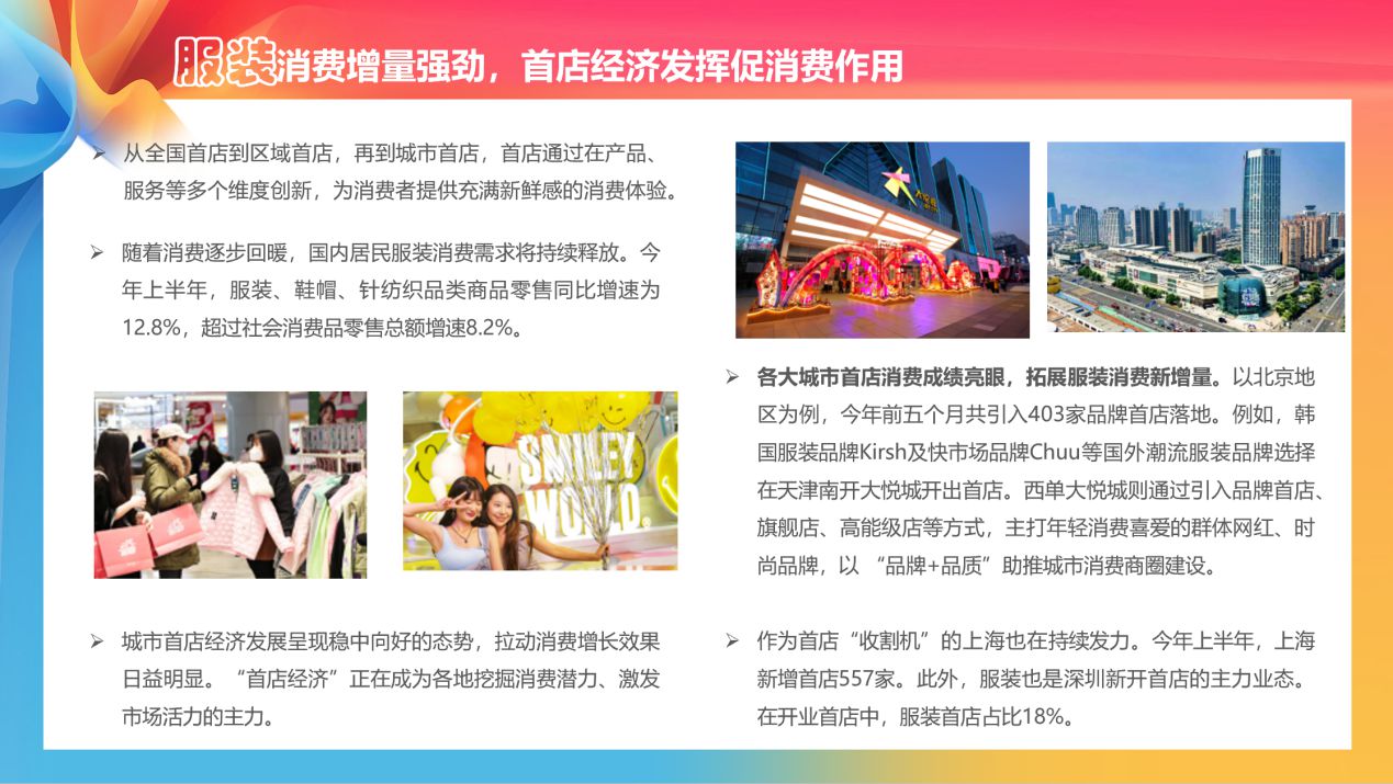 在服裝消費方面,隨著消費逐步回暖,國內居民服裝消費需求將持續釋放。以北京地區為例,今年前五個月共引入403家品牌首店落地。例如,韓國服裝品牌Kirsh及快市場品牌Chuu等國外潮流服裝品牌選擇在天津南開大悅城開出首店。西單大悅城則通過引入品牌首店、旗艦店、高能級店等方式,主打年輕消費喜愛的群體網紅、時尚品牌,以“品牌+品質”助推城市消費商圈建設。《報告》認為,“首店經濟”正在成為各地挖掘消費潛力、激發市場活力的主力。
